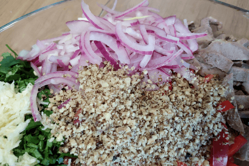 Drain the vinegar from the onion (save it for the sauce), then place the onion and chopped walnuts in a dish.
