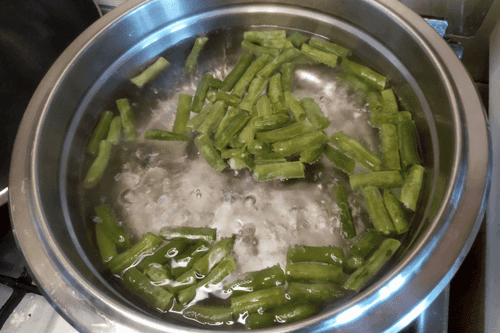 Blanch the green beans in boiling water for 5–7 minutes, then drain and rinse with cold water for 2 minutes.