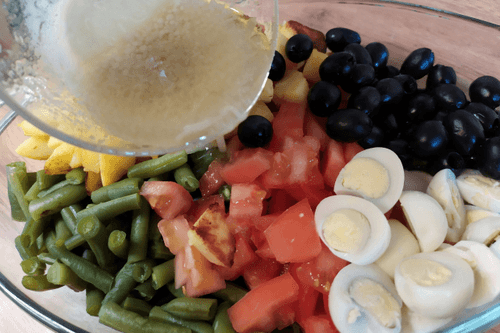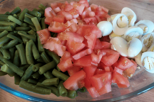 Combine eggs, beans, tomatoes, and potatoes. Add olives.