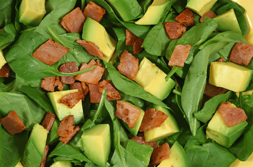 Place spinach in a bowl, add beans, bacon, and chopped shallot. Dice the avocado and add it to the bowl.