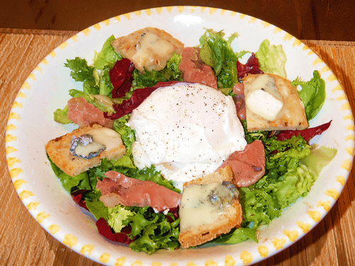 This exquisite warm salad with Parma ham, poached egg, and goat cheese is a true example of French culinary refinement. The combination of delicate poached egg, crispy fried ham, and creamy goat cheese creates a rich texture and complex flavor—from the slight acidity of balsamic vinegar to the savory saltiness of the ham. This salad is perfect for both a morning breakfast and a cozy dinner, offering gastronomic delight. The dish's origins can be found in the traditional French love for refined salads where the freshness of greens meets the warm, rich flavors of toppings. It pairs perfectly with crispy toasts and light wine, adding an irresistible charm to the classic French dining experience.