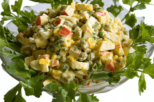 Crab salad with tarragon is an exquisite dish of American cuisine that combines the freshness of seafood with aromatic herbs. Historically, crabs are one of the favorite ingredients in the coastal regions of the USA, and tarragon adds a refined spice to the dish. Tender crab meat is combined with a tangy sauce made from egg yolk, vinegar, and olive oil, creating a harmony of flavors. Tarragon leaves and green onions add freshness, while serving on slices of juicy tomatoes with crispy romaine leaves makes the salad not only tasty but also aesthetically appealing. Serving with a crispy baguette highlights the dish's sophistication. This salad is perfect for a light lunch or an elegant appetizer, adding a touch of elegance to the meal.