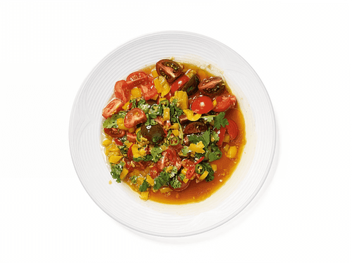 Tomatoes in a sour-spicy sauce are a true gastronomic adventure into the world of Pan-Asian flavors. This recipe combines the freshness of cherry tomatoes with the spiciness of chili peppers and rich notes of garlic and ginger, creating a harmonious blend of acidity, sweetness, and heat. The origins of such combinations can be found in Asian culinary traditions where fresh vegetables are complemented by complex sauces to enhance their natural flavors. The sauce, rich in aromas of soy sauce, cilantro, and lemon, adds depth and layers to the dish's flavor. This dish is perfect as a light appetizer or side dish, beautifully complementing meat and fish dishes while refreshing the taste of main courses with its brightness and richness. Ideal for lovers of Asian cuisine who appreciate balance and intensity in flavor experiences.