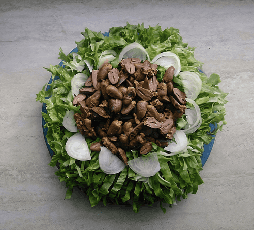 Chicken heart salad is a hearty and nutritious dish that comes from Russian cuisine. It harmoniously combines tender chicken hearts sautéed in vegetable oil and infused with the aroma of soy sauce, with crispy fresh lettuce leaves and caramelized onions. This dish has a rich, slightly spicy flavor where meaty juiciness intertwines with the soft sweetness of onions. Chicken hearts were often used in traditional Russian cuisine as an affordable and healthy source of protein. This salad is not only suitable for a family dinner but also decorates a festive table with its appetizing appearance and rich taste.