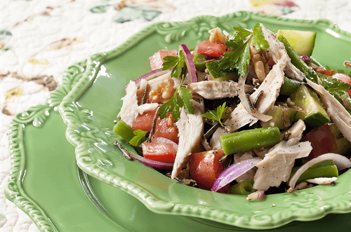 Warm tuna salad is an elegant blend of freshness and tenderness inspired by Mediterranean traditions. Tender tuna fillet steamed with aromatic onion and garlic reveals its refined flavor complemented by crunchy green beans. Vegetables like juicy tomatoes, refreshing cucumbers, and tangy red onion add richness and texture variety to the salad. A French dressing subtly unites the ingredients, while chervil sprigs add notes of freshness and sophistication. This salad is perfect as a light dinner or refined appetizer highlighting the harmony of natural flavors.