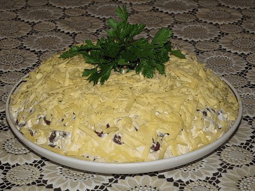 For brightness, you can sprinkle a layer of cheese with grated boiled yolk.