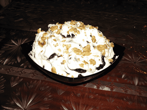 Layer the stuffed prunes in a small salad bowl, pouring sour cream over each layer.