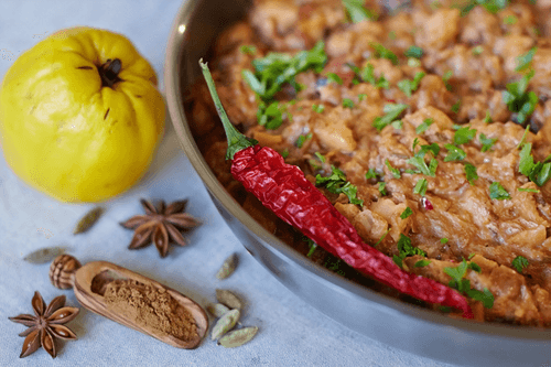 Quince chutney is a fragrant sauce from Indian cuisine that combines sweetness, spiciness, and a hint of acidity. Its history dates back centuries when spices played a key role in local dishes. Quince, a fruit with a honey-like tart flavor, pairs perfectly with balsamic vinegar and spices to create a rich and complex taste. The chutney has a thick consistency and rich aroma where cardamom, star anise, and cinnamon add Eastern notes while ginger and chili provide spiciness. Served cold or hot, it complements meat, fish or cheese beautifully and serves as an exquisite accompaniment to rice and bread. This chutney is not just a sauce but a true culinary masterpiece that reveals the uniqueness of Indian gastronomy.