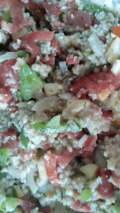 Chop the tomatoes, pepper, and apple, and mix with the grains.