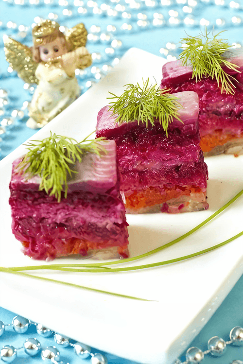 Herring under a fur coat with cheese is a variation of the famous Russian salad that has become an integral part of festive tables. It originated in the Soviet era when housewives sought ways to make traditional dishes even tastier. Here, the familiar layers of potatoes, beets, and carrots are combined with delicate grated cheese that adds creaminess and rich flavor to the dish. The herring soaked in mayonnaise becomes soft and pairs perfectly with the other ingredients. The light spiciness of the onion complements the sweetness of the beetroot, while eggs add airiness. This salad not only pleases the eye with its bright appearance but also satisfies while remaining tender and harmonious in taste. It is perfect for festive gatherings, especially in cold weather when one craves something cozy and hearty.
