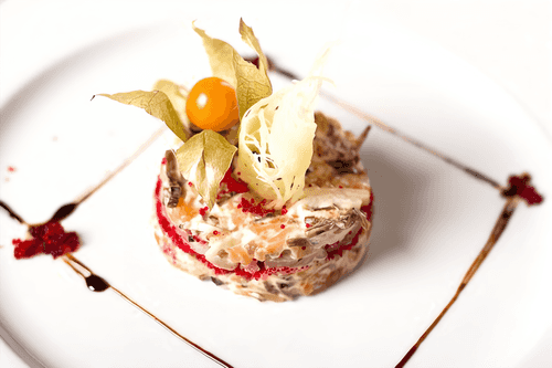 Meat salad with sardines is a refined dish of Tatar cuisine that combines the tenderness of beef with the spiciness of sea fish. Historically, meat salads in Tatar gastronomy often served as a hearty appetizer at large feasts. In this recipe, beef sautéed with chili pepper harmoniously pairs with tender sardines and onions, creating a rich flavor. Olive sauce with wine vinegar and herbs adds freshness and sophistication to the dish. This salad is perfect as a standalone dish or as an accompaniment to the main meal. It retains its flavor well after cooling, making it a versatile option for festive tables.