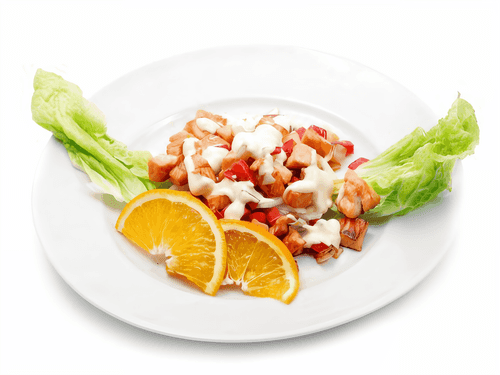 Chicken salad with fruits is a harmonious blend of tender chicken meat, juicy berries, and exotic fruits seasoned with spicy curry. This recipe emerged from European cuisine, known for its culinary experiments and pursuit of flavor balance. The lightness of the salad makes it perfect for a summer dinner or festive gathering. The sweetness of pineapple and strawberries gently intertwines with the spiciness of curry, while the creamy dressing adds softness and richness. Crispy lettuce leaves and coconut flakes complete the composition, giving the dish a unique aroma and texture. This salad not only delights the taste but also creates a sense of freshness and lightness, making it an excellent choice for those who appreciate sophistication and original gastronomic solutions.