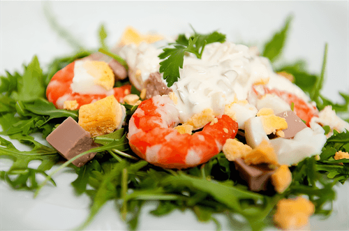 Shrimp salad with cod liver is a refined combination of marine and delicate flavors that adds nobility to the dish. Cod liver, valued for its nutrition, blends with juicy tiger shrimp to create a harmony of textures. Arugula adds a refreshing bitterness, while eggs contribute softness. Pickled cucumbers and mayonnaise enrich the dish with a delicate spiciness. This salad, popular in European cuisine, often adorns festive tables and is perfect for special occasions when served chilled to fully reveal all flavor nuances.