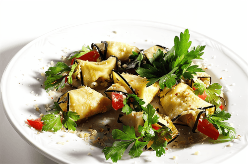 Boil the eggplants until half-cooked, then fry them in vegetable oil. Cut the cooled eggplants into thin slices. Roll each slice into a roll.