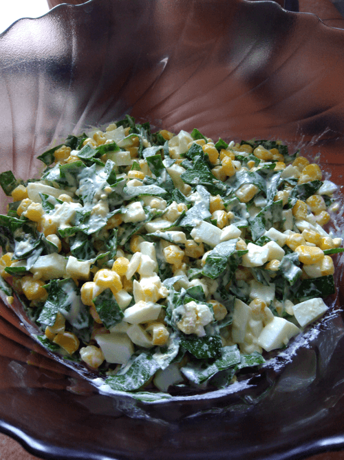 Wash the ramsons well and cut off the tips of the stems. Chop finely, leaving a few whole leaves for decoration. Transfer to a bowl with the eggs. Add the corn.