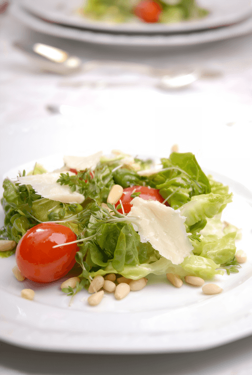 Green salad with cherry tomatoes and pine nuts is the essence of freshness and flavor harmony. Its roots trace back to European culinary traditions where simplicity meets sophistication. Crunchy romaine lettuce and peppery arugula create the perfect base, while sweet cherry tomatoes add juiciness. Pine nuts provide a light creaminess and depth, while parmesan finishes the composition with a delicate richness. A dressing of lemon juice, olive oil, and garlic adds a zesty note that awakens the appetite. This salad works well as a light standalone dish or as an exquisite side for meat and fish. It's perfect for summer lunches, romantic dinners, or healthy eating, offering freshness and pleasure in every bite.