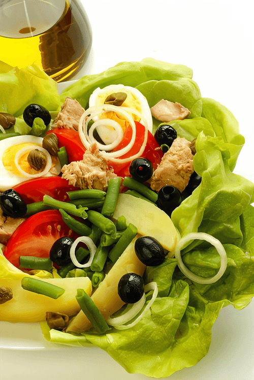 Salad 'Nicoise' is a vibrant dish embodying the richness of Mediterranean flavors. Its history begins in southern France, in sunny Nice, where fresh vegetables, aromatic olives, and tender tuna create a harmonious ensemble. Light yet rich, it delights with crunchy peppers and green beans, soft potato slices and juicy tomatoes. Anchovies add a salty depth to the flavor while eggs contribute tenderness. The dressing of olive oil and wine vinegar highlights the freshness of the ingredients, binding them together. This salad is perfect as a standalone dish or light appetizer, beautifully complementing a summer table and pleasing anyone who appreciates simplicity and sophistication.