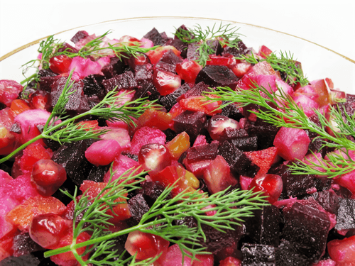 Vinaigrette in Russian style is a true embodiment of Russian cuisine, a simple yet remarkably harmonious dish. Its history goes back centuries when the combination of available vegetables and mushrooms became the foundation of nutrition in Russia. The main ingredient - beetroot - gives the salad a rich ruby color and sweet taste that perfectly contrasts with the spiciness of pickled cucumbers and aromatic mushrooms. The dressing made from vegetable oil, vinegar, and mustard highlights the flavor palette while adding a slight sharpness. This salad is not only beautiful on a festive table but also great for everyday meals as it is nutritious and healthy. It can be served as an independent dish or as a side to meat and fish, with the variety of textures making each bite unique.