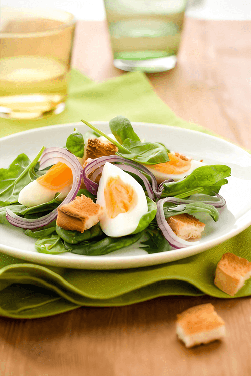 Warm spinach salad with garlic croutons is a refined dish of Italian cuisine where simple ingredients transform into a true gastronomic delight. Its origin traces back to Mediterranean culinary traditions where the freshness of products and balance of flavors play a key role. Tender, slightly sweet spinach is sautéed to reveal its rich herbal notes, while the creamy parmesan sauce adds depth. Crispy garlic croutons provide textural contrast, and boiled eggs and red onion complete the composition with richness and zest. This salad is perfect as a warm seasonal dish, combining lightness and nutrition, while its sophisticated taste makes it an excellent choice for a cozy home dinner or a stylish restaurant evening.