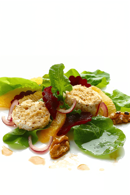 This warm salad combines the tenderness of mozzarella fried in crispy breadcrumbs with the natural sweetness of roasted beets and potatoes. Originating from Italian cuisine, it embodies comfort and gastronomic pleasure. The breaded mozzarella acquires a golden crust, contrasting with the velvety texture of root vegetables enriched with thyme and olive oil aroma. Balsamic vinegar adds a touch of zest, while lemon dressing refreshes the composition. The final touch is tender salad leaves and spinach that make the dish light and harmonious. Such a salad is perfect for a leisurely dinner or festive gathering, bringing a warm atmosphere of Italian hospitality to the table.