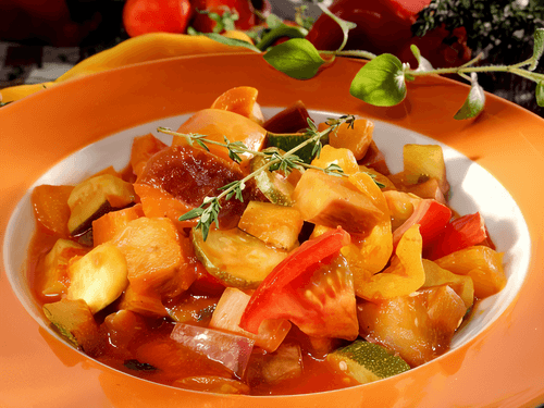Peel the tomatoes, cut them in half, and remove the seeds. Add them to the eggplants and zucchini.