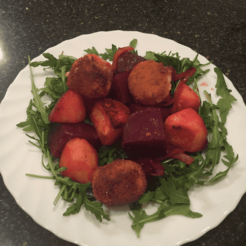 Warm crispy salad with fried mozzarella, beets, new potatoes and arugula