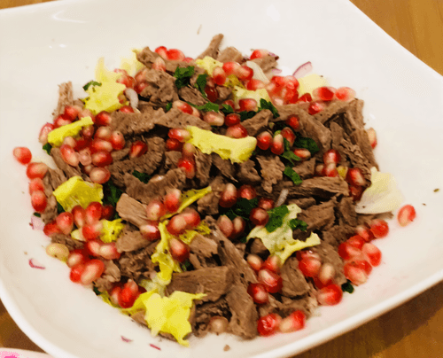 Meat salad with onions and pomegranate seeds