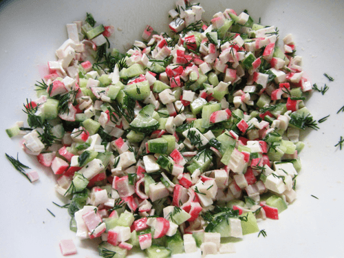 The delicate salad is the embodiment of lightness and sophistication of Italian cuisine. Its base is fresh cucumbers that give the dish a crunchy freshness, while crab sticks add a soft sweetness of seafood. Feta cheese contributes a creamy texture and subtle tanginess, while herbs complete the composition with aromatic freshness. This salad is perfect for a light dinner or as a festive appetizer. Due to the softness of the ingredients, it can be served in cylindrical portions, creating an aesthetic look on the plate. A dressing of sour cream or mayonnaise can add tenderness if the feta cheese is too dense. The combination of simple components and harmony of flavors make this salad versatile — it suits both everyday tables and festive feasts, surprising with its refined simplicity.