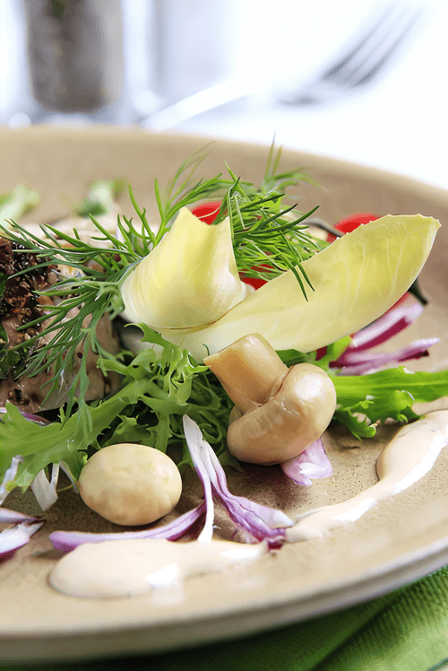 Mushroom salad with cheese sauce is a refined dish of French cuisine that combines the tenderness of mushrooms with the rich flavor of Roquefort. This recipe has its roots in France's gastronomic traditions, where complex yet harmonious flavor combinations are valued. Lettuce adds freshness and crunch, while the creamy cheese sauce contributes softness and zest. Chervil and shallots complement the composition with subtle spicy notes. The dish is perfect as a light appetizer or standalone meal and can be served with baguette or white wine for full enjoyment. Easy to prepare and elegant in presentation, this salad becomes a centerpiece on the table and delights gourmets with its sophisticated taste.