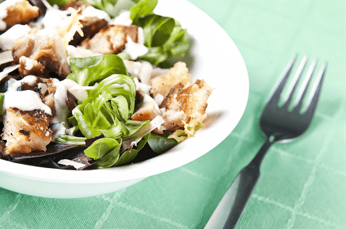 Combine the leaves of rapunzel with meat and croutons. Dress the salad with sauce and sprinkle with sesame.