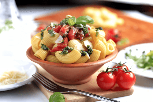 This salad with pasta, tomatoes, cheese, basil, and lemon is a true symphony of Italian flavors. It draws from the Mediterranean culinary tradition where fresh and simple ingredients harmoniously combine to create light and exquisite dishes. The tender al dente pasta absorbs an aromatic sauce made of olive oil, lemon zest, and basil that gives it freshness and a slight citrus tang. Sweet, juicy tomatoes contrast with dense cheese cubes while lettuce adds a crunchy texture. This dish is perfect for summer dinners, picnics or light lunches, reminiscent of sunny streets in Italy. It is quick to prepare and brings true gastronomic pleasure by combining simplicity and elegance in every forkful.