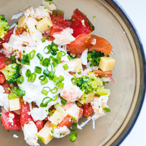 Crab salad with cheese, broccoli and green onions