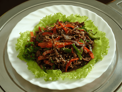 Lamb salad with basil and sesame is a refined dish that combines the tenderness of roasted lamb, the freshness of basil, and the spiciness of sesame. Its roots trace back to European cuisine, where the harmonious combination of meat and herbs is valued. The lamb infused with garlic and cognac gives the salad a rich flavor, while sweet peppers and tomatoes add juiciness and brightness. Toasted sesame seeds introduce a light nutty note, making the dish's texture more interesting. This salad is perfect for both festive dinners and light yet nutritious lunches. The cognac sauce in which the meat was cooked emphasizes its rich taste, while basil adds freshness and a noble green note.