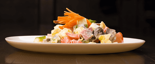 Ham salad with cheese and pineapples is a harmony of contrasts that combines the rich flavor of ham, the creamy tenderness of cheese, and the sweet exoticism of pineapple. This dish emerged in modern Russian cuisine, bringing notes of sophistication and festive spirit. Eggs add softness while fresh tomatoes provide juiciness and a slight tang. Green onions add zest, and the dressing made from mayonnaise and yogurt gives a gentle and balanced taste. Such a salad not only looks great on a festive table but also suits a quick, nutritious snack. The ease of preparation and the combination of simple yet expressive ingredients make it a favorite dish for many gourmets.