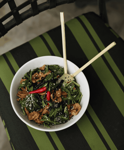 Light Thai salad with beef is a harmony of freshness and rich flavor. It features tender pieces of beef soaked in a spicy chili-garlic sauce combined with crispy lettuce leaves, aromatic mint, cilantro, and basil. The traditional Thai dressing made from lime juice, brown sugar, and fish sauce adds a subtle sweet-sour note to the dish. Fried rice ground to a powder adds unique texture and a light nutty taste, while roasted peanuts finish the composition with a crunchy touch. This salad perfectly reflects Thai cuisine: it is light, vibrant, and rich—ideal as a standalone dish or a refreshing side for the main dinner.