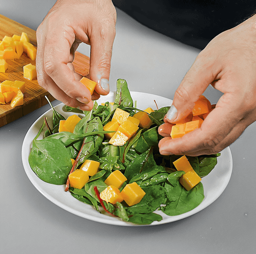 Peel the fresh mango, remove the pit, and cut the flesh into small cubes. Place two to three handfuls of fresh salad leaves on plates, and top them with the mango cubes.