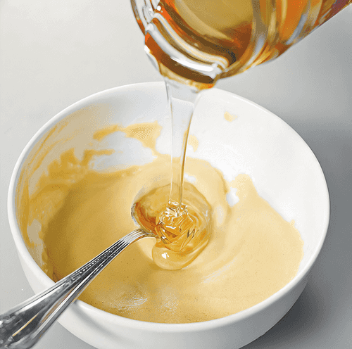 Prepare the dressing. In a small bowl, whisk Dijon mustard with a fork while gradually adding olive oil. Add honey and then regular hot mustard to the mixture. Mix well.