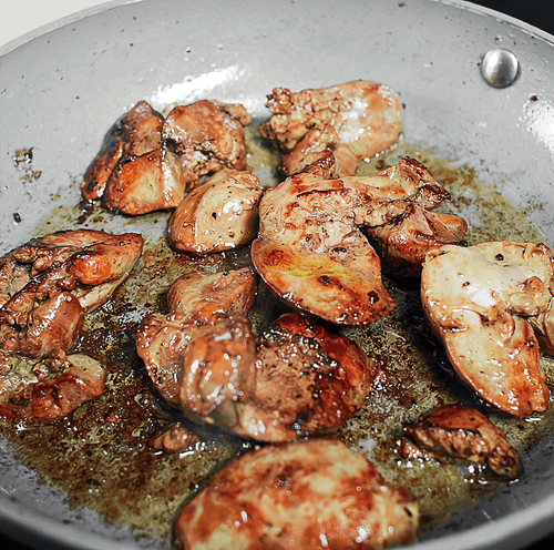 In a small pan, heat vegetable oil and quickly fry pieces of chicken liver on all sides until a golden brown crust forms. Season with salt and pepper to taste.