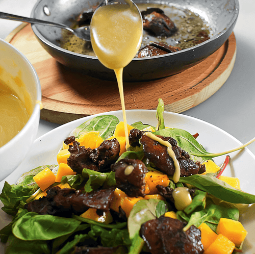 Warm salads are a seasonal thing, ideal for early autumn, when it is not too cold to dream of a hot stew, and not so hot that you can make do with a salad bowl of fresh vegetables for lunch. Chicken liver does not need to be fried for long - just three or four minutes in a frying pan will be enough. And mango, if possible, is best bought in advance, a couple of days before use, to let it ripen at home to the ideal condition.