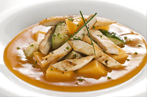 Smoked chicken salad with pear is an exquisite dish of French cuisine that combines sophistication and vibrant flavors. The tender meat of smoked chicken harmoniously intertwines with the juiciness and sweetness of pears, which gain a piquant depth thanks to marination in honey-wine sauce. Fresh salad leaves, aromatic Provencal herbs, and a light tartness of red currants complete the ensemble, creating an elegant gastronomic delight. This salad is perfect for a festive dinner or romantic evening, impressing with its refinement and balance of flavors. It can be served as a standalone dish or as part of an exquisite menu, complemented by a glass of white wine. Such a culinary masterpiece not only pleases the eye but also reveals the beauty of French gastronomy.