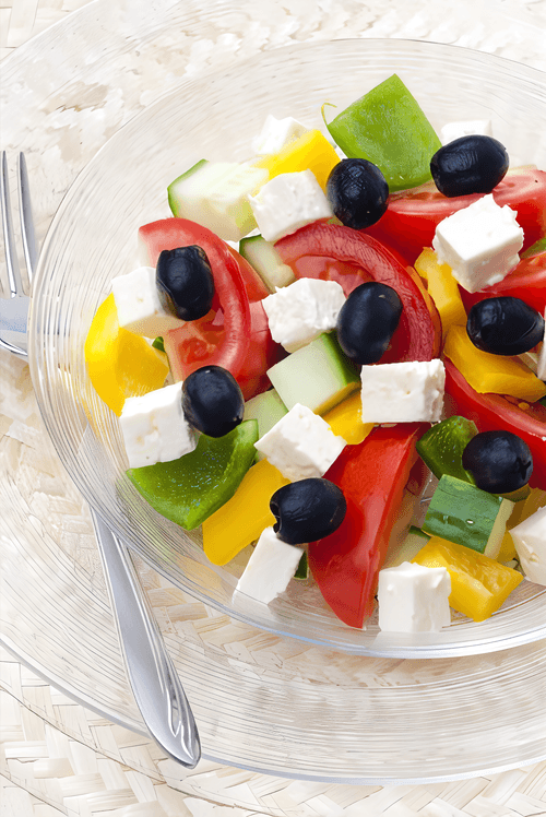 Place the vegetables, olives, cheese, and greens in a salad bowl. Gently mix to avoid crushing the salad components.