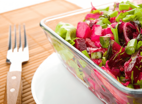 Sprinkle the salad leaves with vinaigrette and mix well. Divide into 4 plates. Top with beetroot and green onion and serve.