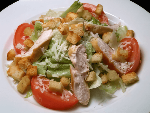 Place lettuce leaves, chicken breasts, add croutons, dress with 'Cheesy Caesar' sauce, sprinkle with grated parmesan, and garnish with tomato slices.