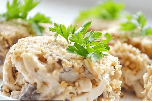 Layered salad with ham and mushrooms 'Beloved' is a delightful dish of Russian cuisine that has won hearts with its delicate taste and harmony of ingredients. It combines the saltiness of ham, the freshness of apples, the spiciness of garlic, and the creaminess of melted cheese to create perfect gastronomic pleasure. The light layers make the salad airy, while nuts add a pleasant crunch. The history of such layered salads goes back to festive table traditions where not only satiety but also aesthetic enjoyment was important. 'Beloved' is perfect for family dinners, celebrations, and gatherings with loved ones, highlighting the coziness and warmth of home meals. Its rich flavor and appetizing appearance make it the center of attention at any table.