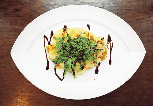 Mango and sea bass salad is an elegant and refined dish where the freshness of seafood meets sweet fruit notes. Inspired by European gastronomy, this salad resembles carpaccio but with a sophisticated tropical twist. Thinly sliced sea bass fillet, tender and juicy, is complemented by soft strips of mango, creating a balance between freshness and sweetness. A light lemon juice and olive oil add a subtle tanginess, while arugula adds spiciness and texture. The finishing touch is reduced balsamic vinegar that gives depth of flavor and harmony to the dish. This salad is perfect as a light appetizer for a romantic dinner or an exquisite element of a festive menu, impressing with its simplicity and sophistication.