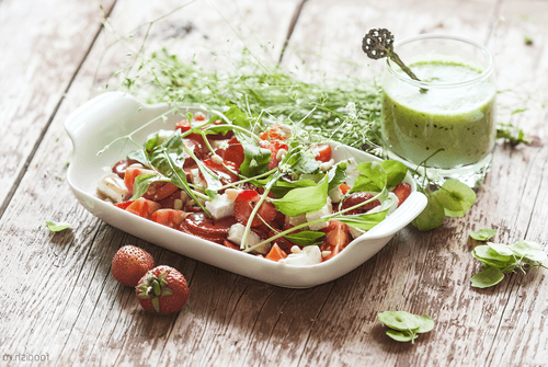 This refreshing Italian salad combines the delicate sweetness of strawberries with the juiciness of cherry tomatoes and creamy mozzarella, creating a harmony of flavors. Arugula adds a spicy note, while balsamic vinegar and olive oil complete the composition, enhancing the freshness and lightness of the dish. Italians have long used fruits in salads, and this recipe is a vivid example of their culinary art. An ideal choice for a summer dinner or appetizer, this salad will pleasantly surprise guests with its exquisite combination of ingredients and elegant presentation.