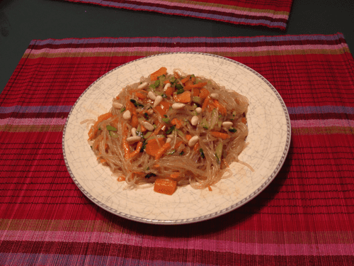 Mix the funchose with sautéed vegetables and cucumber. Add 3 teaspoons of vinegar and soy sauce to taste.