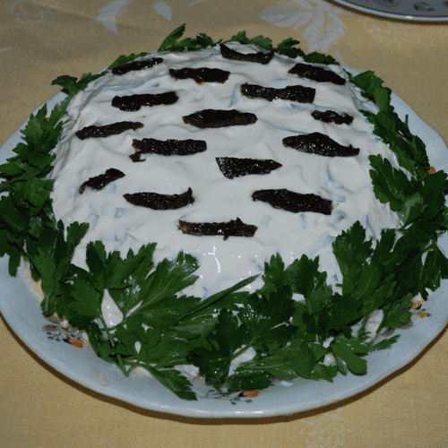 Salad with prunes and mushrooms is an amazing combination of contrasting flavors and textures. Its history may begin in the search for balance between the smokiness of chicken, the sweetness of prunes, and the tenderness of mushrooms. Each spoon reveals a rich taste: smoked chicken breast adds depth, prunes add a light caramel note, while mushrooms and onions create an appetizing base. Mashed eggs, fresh cucumber, and mayonnaise bind the ingredients together into a layered delight. This salad is perfect as a festive dish that highlights the sophistication of flavors and contrasts in textures. It pairs well with meat dishes or can stand alone as a treat. Such a salad not only pleases the eye with its layered presentation but also transforms a simple set of ingredients into a culinary masterpiece.