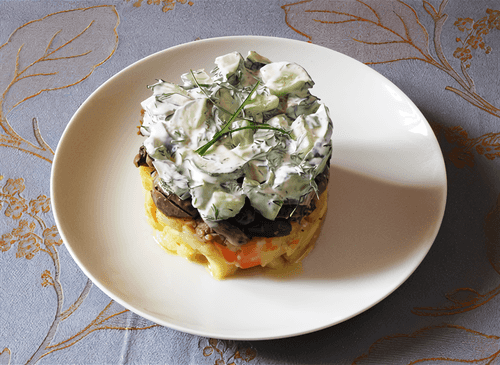 Layer the warm salad using a culinary ring: the first layer of carrots and potatoes, the second - juicy meat assortment, the third - fresh cucumbers and greens with yogurt.