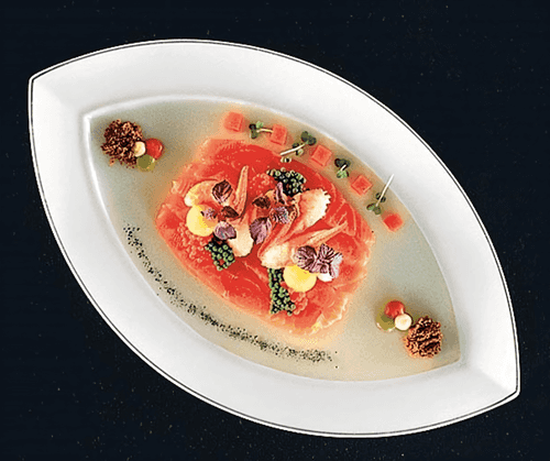 Russian salad with lightly salted salmon is a refined dish that combines the freshness of seafood with the richness of European flavors. Salmon, carefully salted with orange and cognac, acquires a tender texture and subtle citrus notes. Borodinsky bread adds a deep rye aroma, while celery and red pepper jelly provide interesting gastronomic accents. Pea and carrot puree combined with creamy mascarpone paste create a harmonious contrast. The composition is completed by quail yolks and crayfish necks, symbolizing the richness of Russian flavor traditions. This salad is a true gastronomic painting where every detail contributes to the overall harmony of taste and texture.